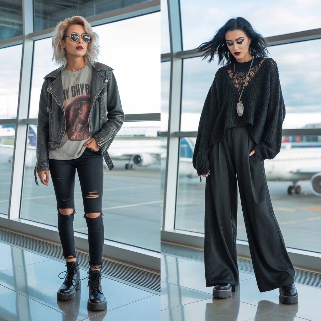 Complete the outfit with chunky sneakers or combat boots for a balance of comfort and edge. Keep your accessories minimal — think a sleek black cap, a crossbody bag, and a touch of subtle jewelry. This combination ensures you stay photo-ready and confident whether you’re exploring city streets, hitting a concert, or boarding your next flight.