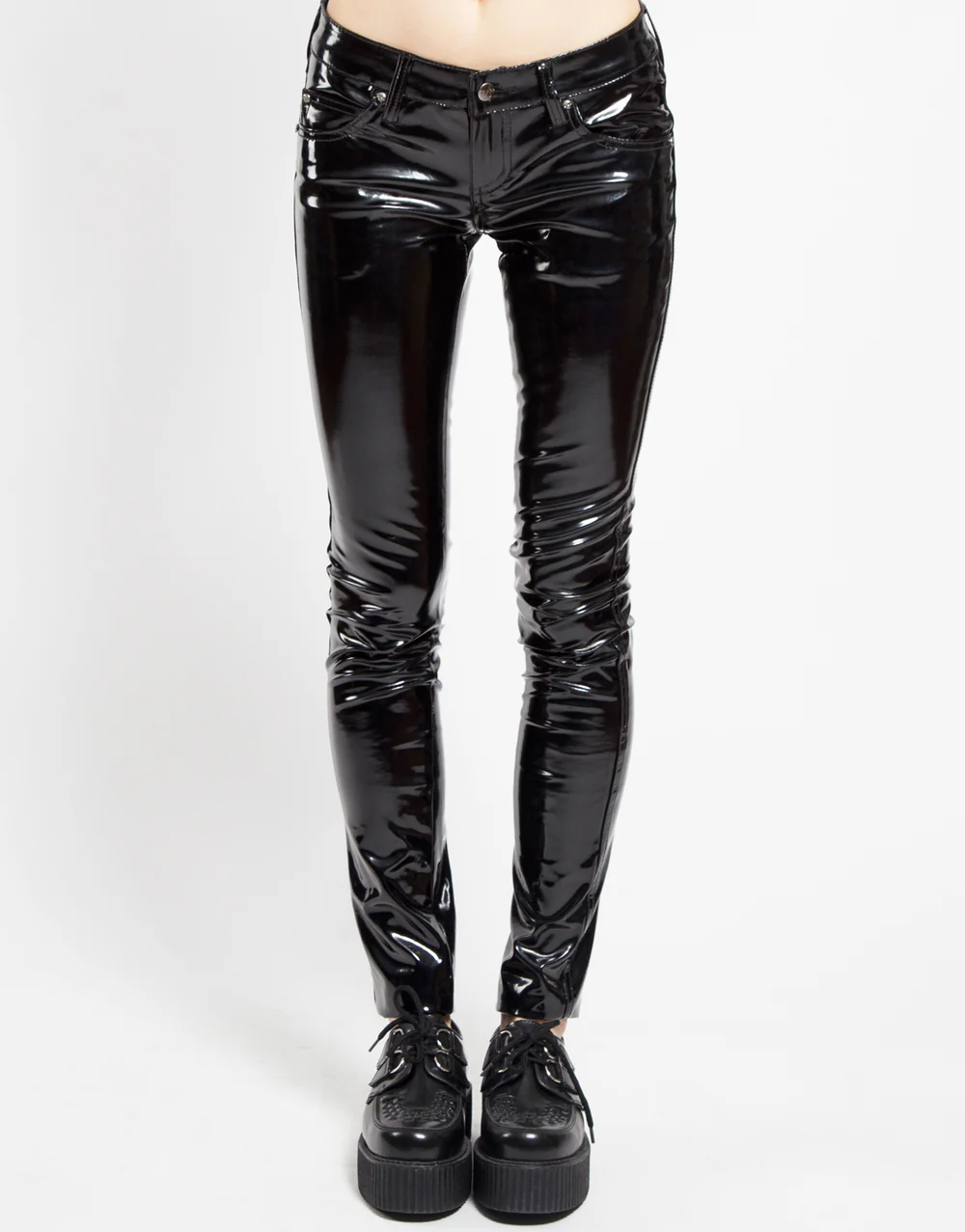 Slick and stretchy, these high-shine vinyl pants are the ultimate in rock n’ roll fashion. Featuring skull rivets, zip fly and button closure.