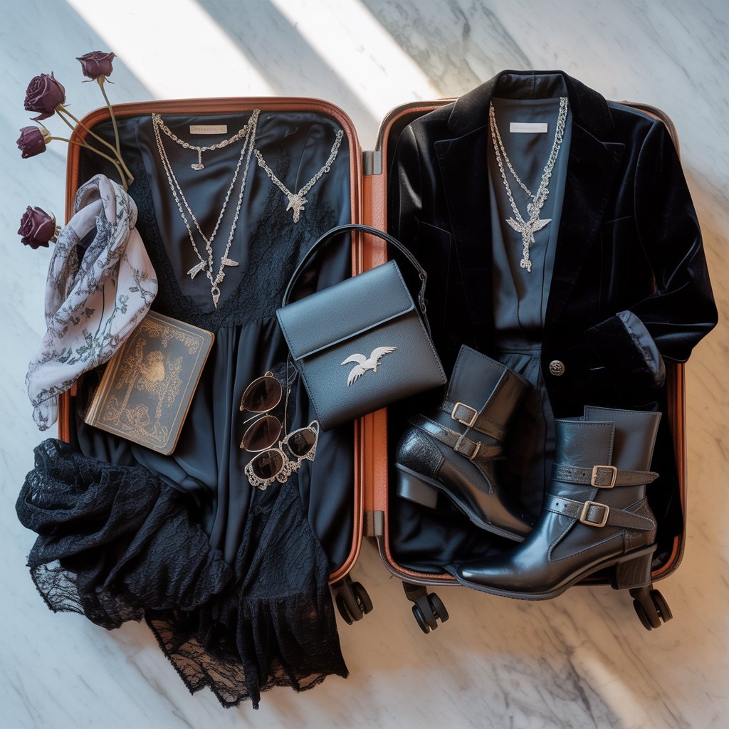 Packing light doesn’t mean sacrificing style. A travel capsule wardrobe focuses on versatile, interchangeable pieces that work across different occasions and climates. For the Romantic Goth traveler, this means combining timeless dark tones with comfortable, travel-friendly materials.